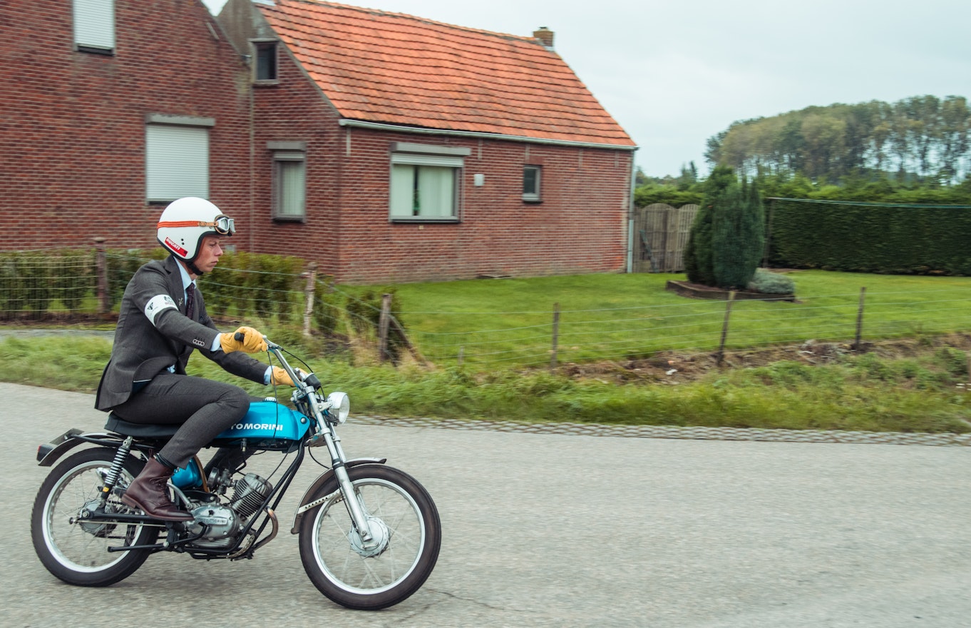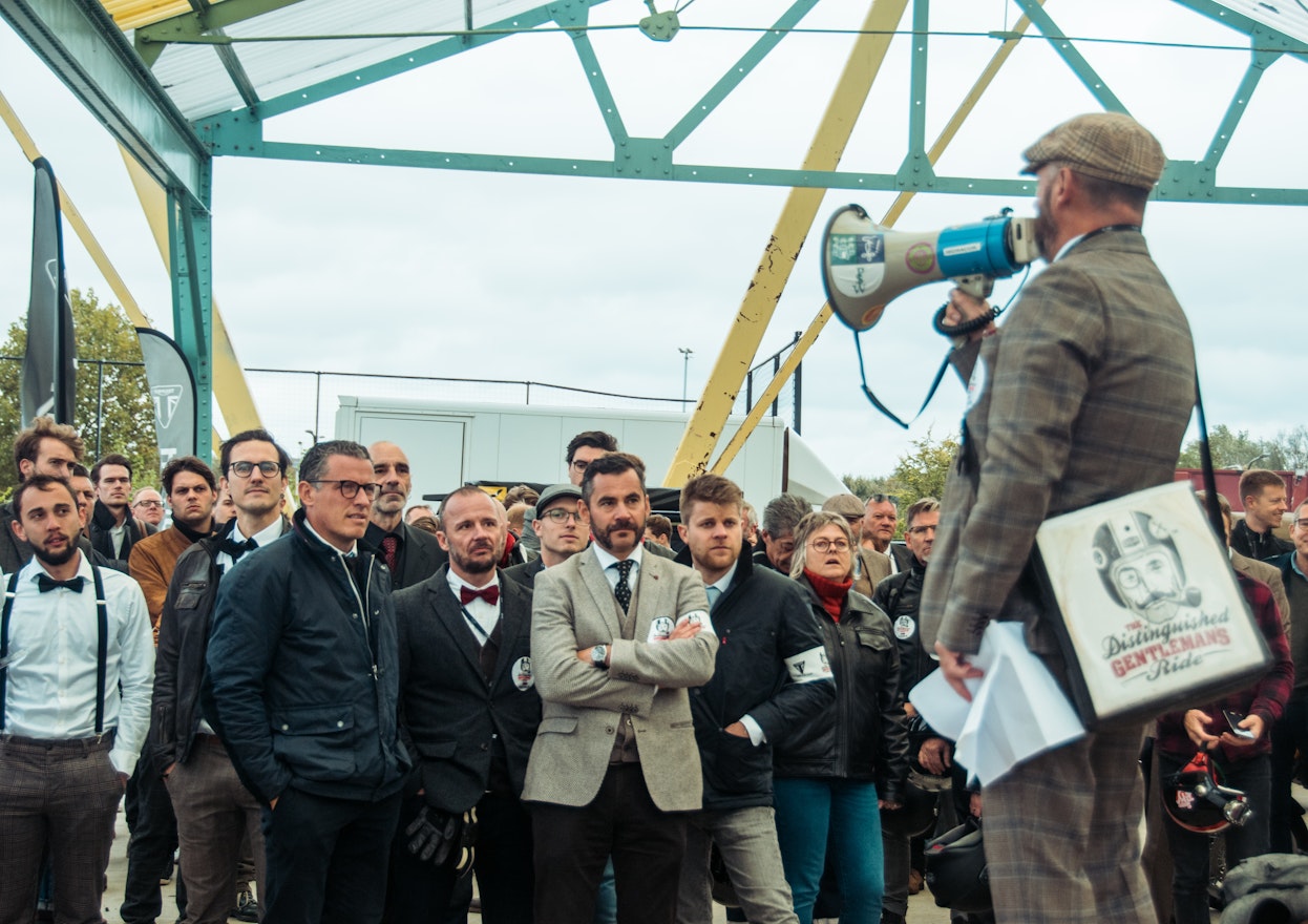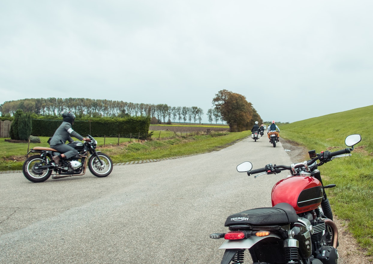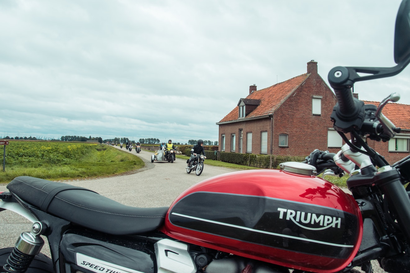 Triumph is met zijn breed arsenaal aan retro-motoren die ideale partner voor dit evenement, dus was de keuze voor mij snel gemaakt. De relatief nieuwe Speed Twin fungeert als het blinkende accessoire bij het oude kostuum van mijn vader. M'n eigen maatpak laat ik liever aan de kapstok hangen omwille van de dreigende wolken. Normaal ging ik deelnemen aan de editie in Gent maar een rode streep op buienradar in de lengte van de E17 doet me teruggrijpen naar men tweede keuze, die van Antwerpen. De editie in mijn thuisstad is alvast met een paar uur uitgesteld om tussen de wolken door te rijden. Bij aankomst is het droog, maar de opkomst lijkt magerder uit te vallen dan vorig jaar toen er een stralende zon scheen. Niet onlogisch dat er weinig mannen en vrouwen staan te springen om hun beste outfit door een plensbui te sturen. Uiteindelijk stroomt er toch nog een flinke groep diehards samen om de stad te laten beven.