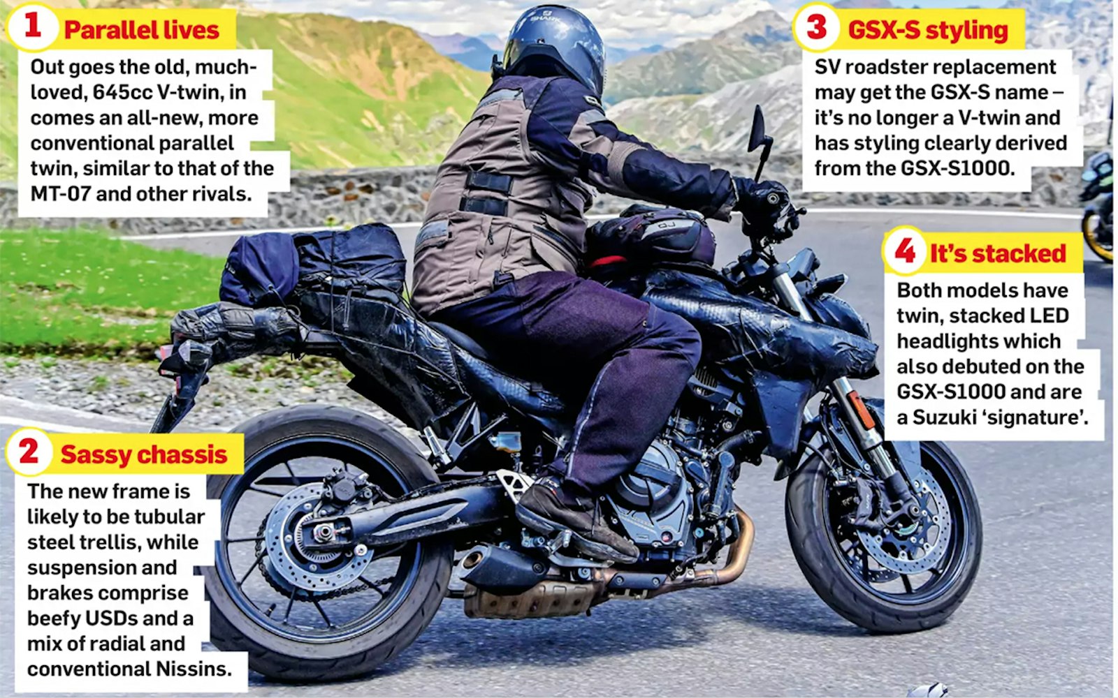 Volgens onze Britse collega’s van het weekblad Motorcycle News werkt Suzuki aan een nieuwe tweecilinder krachtbron. Die nieuwe motor wordt echter geen V-twin meer, maar wel een paralleltwin. En zo gaat Suzuki de strijd aan met ondermeer KTM (890 Duke en 890 Adventure) en Yamaha (MT-07, Ténéré 700). De cilinderinhoud van Suzuki’s nieuwe paralleltwin blok zou en om en bij de 800cc liggen. Rijmodi en andere elektronische hulpmiddelen mogen op beide toekomstige Suzuki modellen verwacht worden.