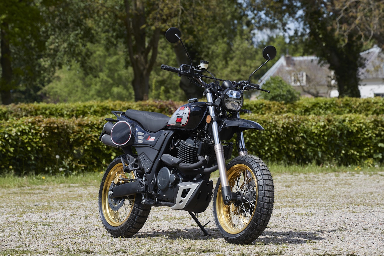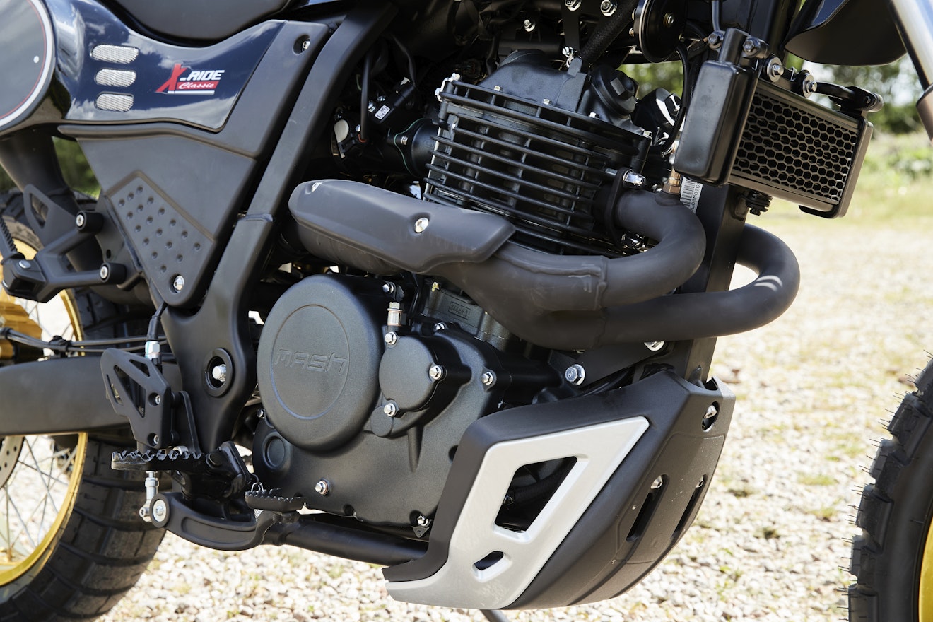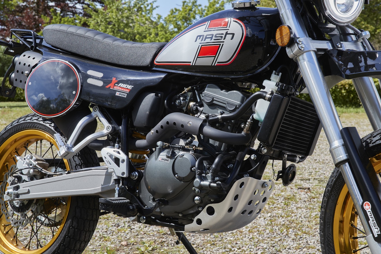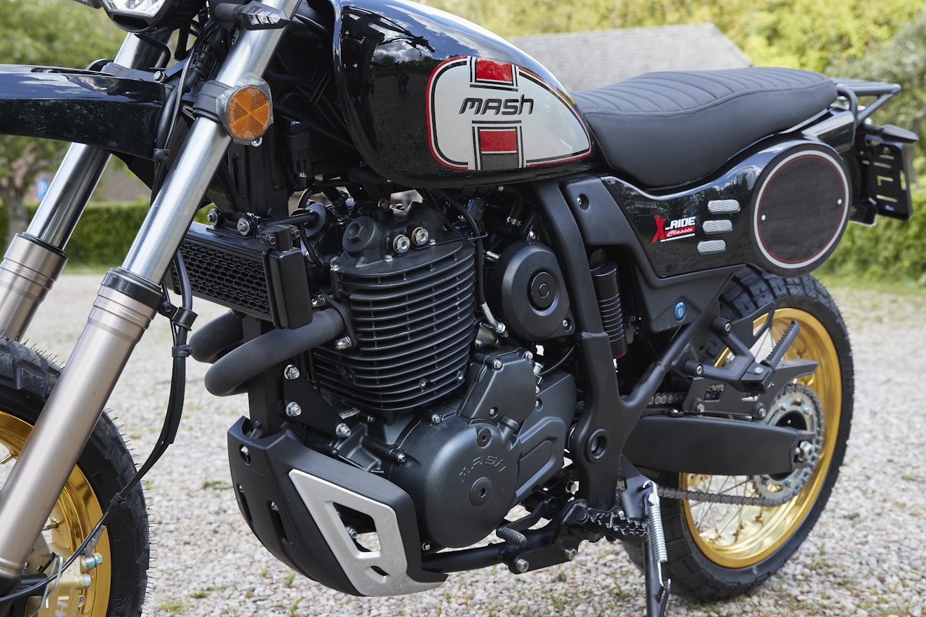 De bezieler van de machines gaat reeds enkele epoques mee en heeft danig veel motorische zaken de revue heeft zien passeren. Vanuit al deze periodes haalt hij enerzijds zijn inspiratie, maar eveneens zijn ervaring om te weten wat nodig is om fijn en zorgeloos motor te kunnen rijden. Meestal zijn het Honda- of Suzuki-achtige krachtbronnen waarvan de plannen ondertussen in publiek bezit zijn gevallen en meestal herkennen we een look die we vroeger reeds vaag eerder hebben gezien. Maar het geheel werkt en de looks zijn geslaagd te noemen. Zo ook bij de volgende klassenbakken, de X-Rides. Bij de 650 lijkt het wel de 1-cilinder Dominator-motor in een XT500-jasje. De zithouding is ontspannen en we krijgen een smal zadel, een breed stuur en goed gepositioneerde voetsteunen. Dit zit lekker crossachtig. Maar verder nodigt de machine niet uit tot hard rijden. Niet dat je eigenlijk weet hoe snel het uiteindelijk gaat, want de tellers zijn voor mij niet leesbaar. Zegt misschien iets meer over mezelf, dan over het dashboard, maar het is alleszins klein te noemen. De gasrespons van de machine is die van een überzachte, dikke mono. Weliswaar met nog niet veel volk in huis in de onderste regionen en al het volk reeds uit huis in de bovenste regionen. In het middengebied is het echter lekker romig vertoeven. Er is reeds veel verteld en geschreven over de stuureigenschappen, en inderdaad, de wielmaten vragen best wat gewenning. Vandaar ook dat vanaf dit jaar (exacte datum moet nog bevestigd worden) de X-rides zullen leverbaar worden met oftewel 17”x 17” wielen, oftewel een 21” x 18” uitvoering. De 650 scoort echter volop in het fijne en aangename rijgevoel dat je erbij krijgt, zelfs al is dat met een typische 1-cilinder trilling. Geen hi-tech, hyperstrak, high-end scheur- of crossijzer, maar een mooie retro offroad machine die volledig past in het toegankelijke karakter van de Mash-familie.