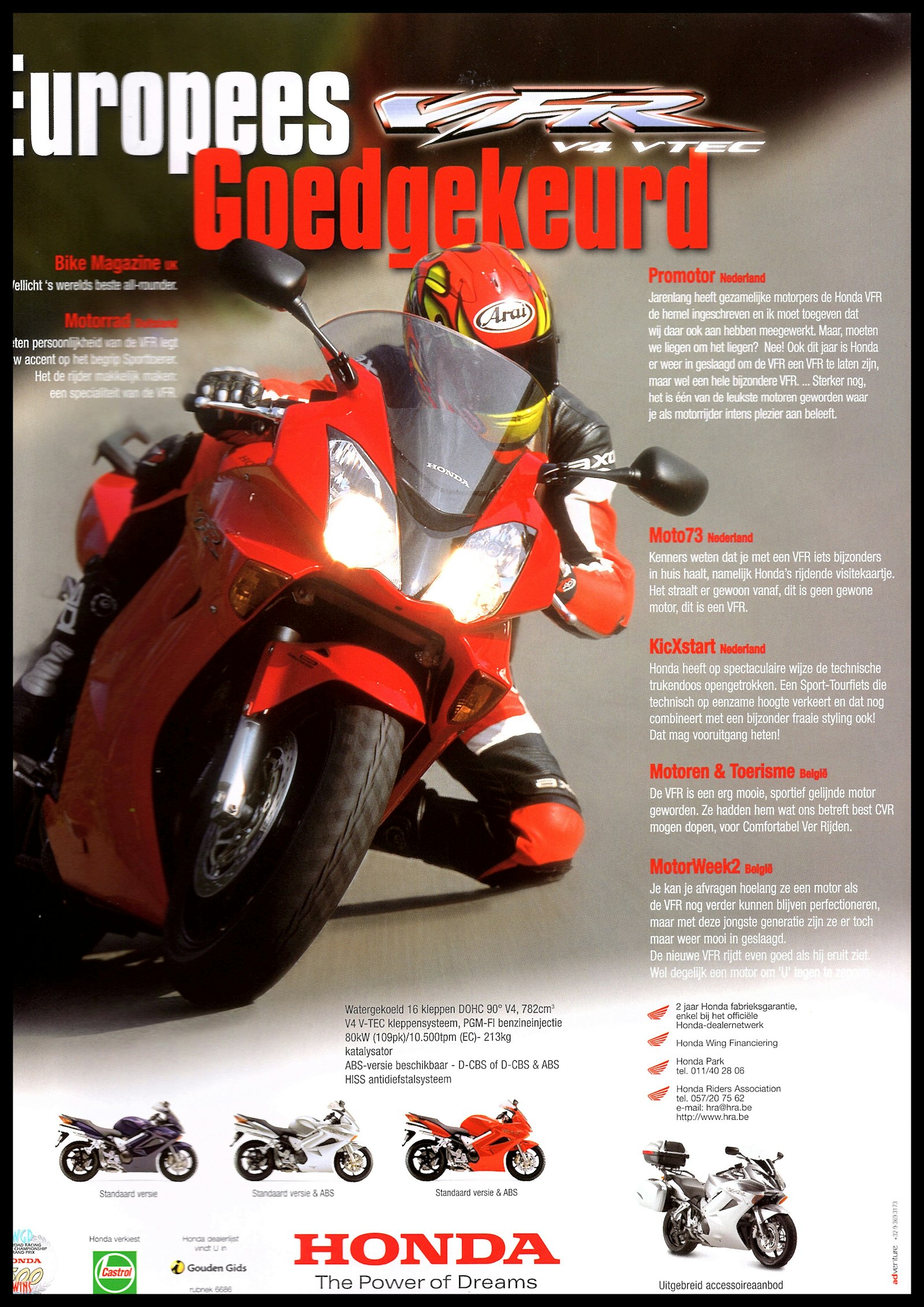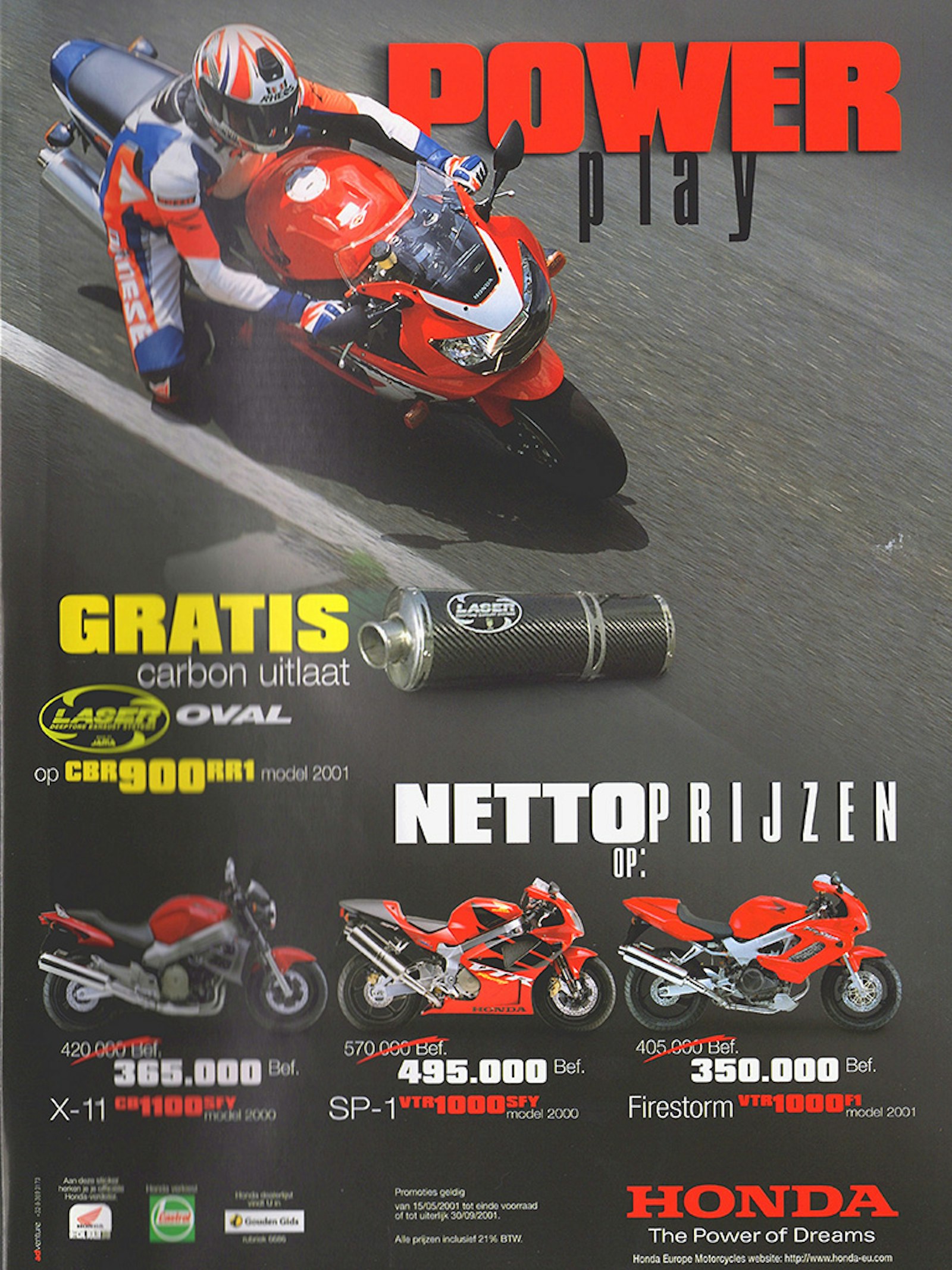 Twintig jaar geleden, in 2001 dus, prijkte in elk nummer van Motoren & Toerisme een Honda-advertentie. 'Big Red' promootte op die manier, via M&T, en ook een beetje via zusterblad MotorWeek2, nagenoeg z'n hele motorfiets-gamma. Het was dus geen probleem om, speciaal voor dit lijstje, aan vijf Honda-advertenties uit 2001 te geraken. Wat meer was, deze advertenties werden destijds, in-house vormgegeven door de jongens van Adventure bvba. Adventure was destijds, het grafisch vormgevingsbureau van Meta Media, de toenmalige uitgever van Motoren & Toerisme.