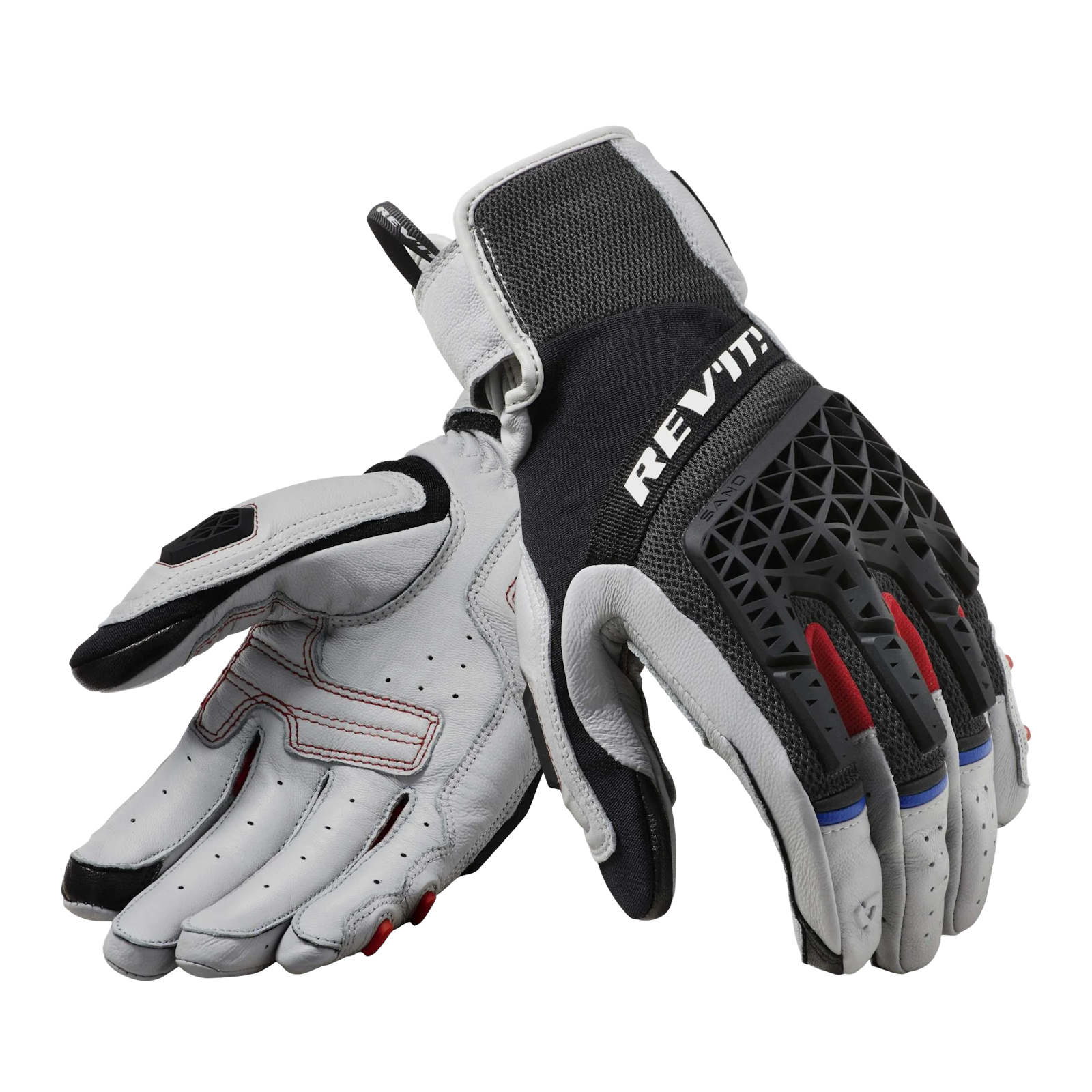 De Sand-collectie is geliefd bij menig adventure-rijder. De handschoen heeft een dikke geitenleren handpalm, gecombineerd met een polyamide stretchstof, mesh en protectoren op de knokkels, duim en pink. Een robuuste maar goed geventileerde combinatie dus.