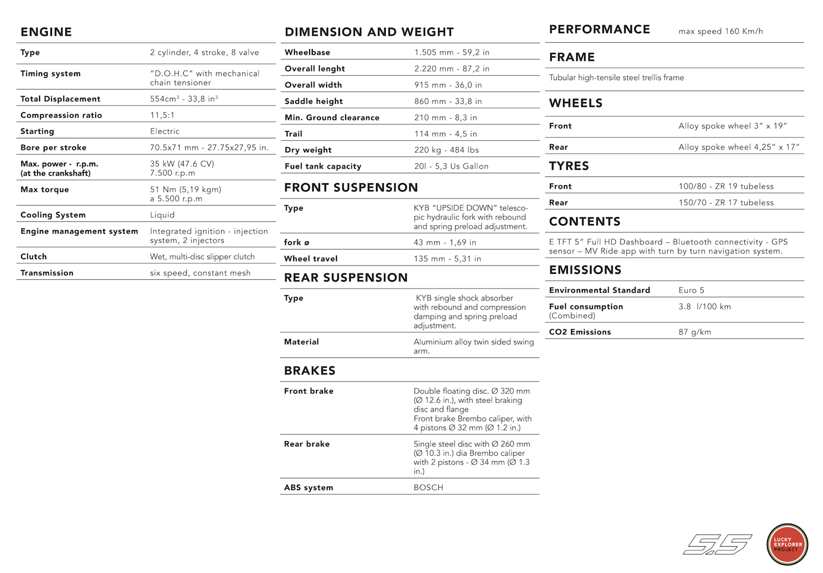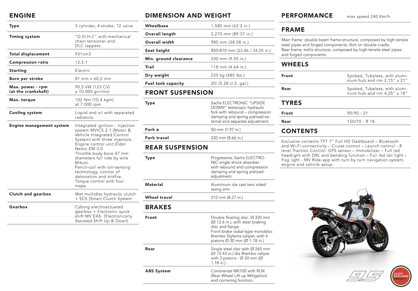 Het Lucky Explorer Project is opgesplits in twee modellen, de lichtere 5.5 en een performantere 9.5. De benaming van deze modellen geven een vrij correcte hint naar de cilinderinhoud, 554 cc en 931 cc. Beide motoren tonen ondanks hun onderliggende verschillen grote uiterlijke gelijkenissen waarmee de 5.5 voor zijn klasse imposant voor de dag komt. Ook de Lucky Explorer livery is op een abstracte manier herkenbaar op beide motoren.