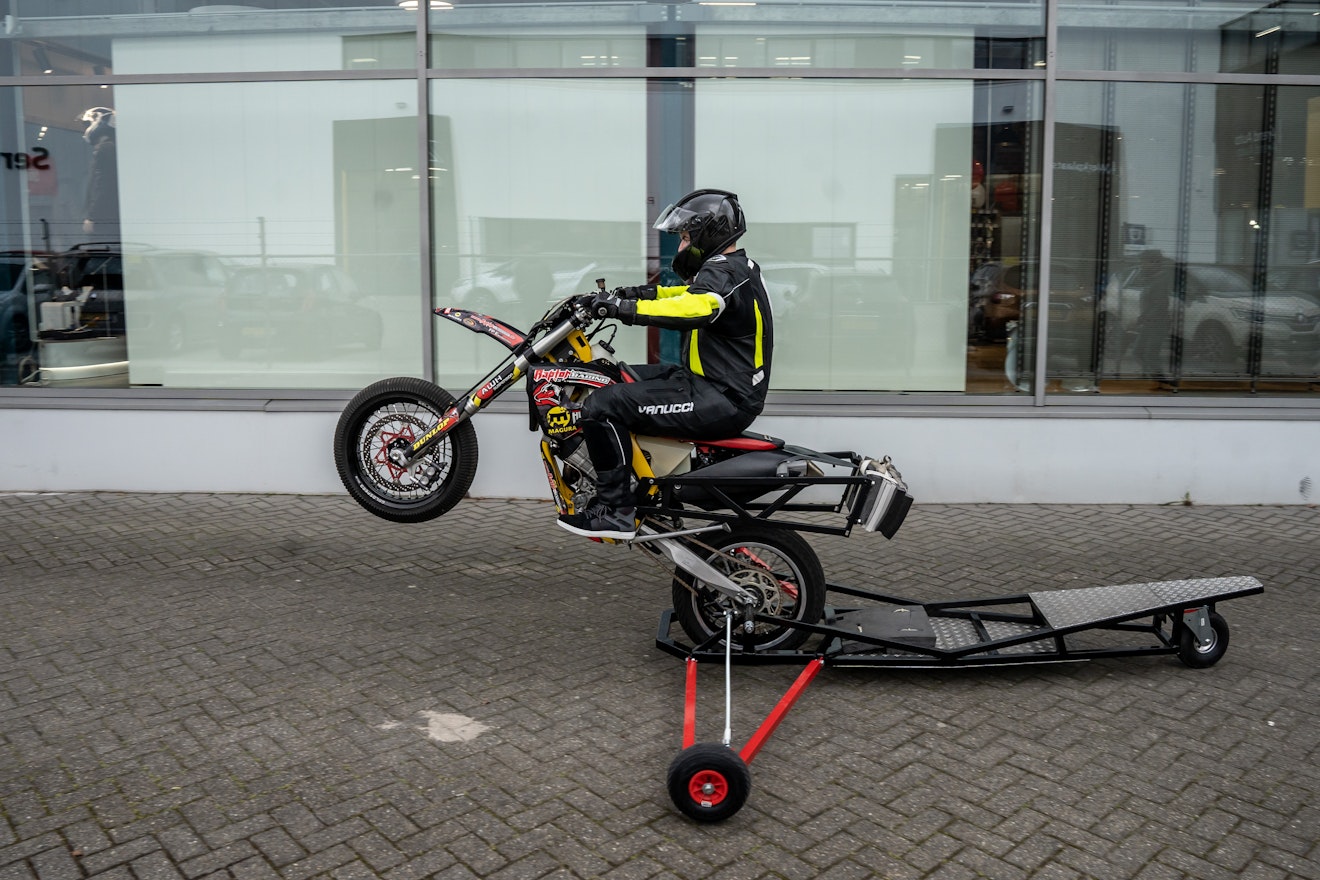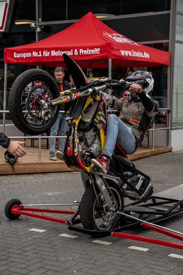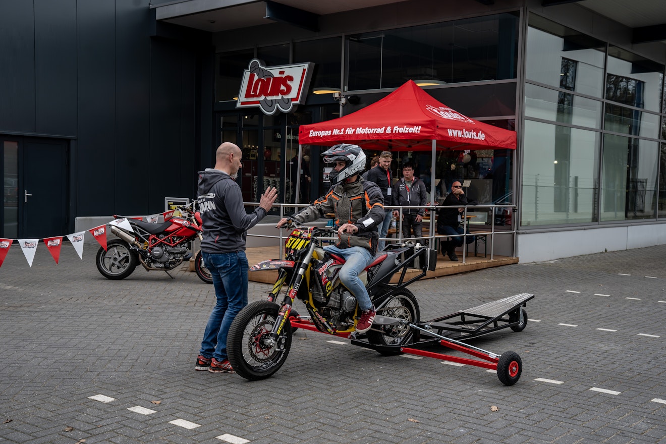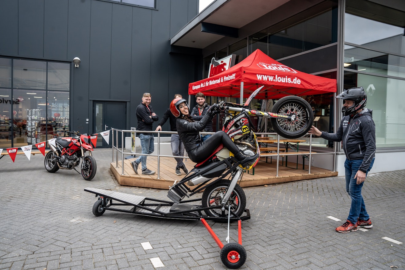 We kregen met professionele hulp een testoutfit van het huismerk Vanucci aangemeten en werden ook nog eens getrakkeerd op een wheelie-cursus. Stuntrijder Jo Bauer had een speciaal geprepareerd Husaberg klaar staan om ons om te dopen tot stuntrijders. Vooruit rollen in eerste versnelling, zo ver mogelijk naar achter, benen geklemd rond de tank, rechtervoet op de acherrem, koppeling lichtjes inhouden en dan laten schieten op zoek naar de juiste balans. Niet gemakkelijk maar na een kwartier kreeg ik gevoel in de vingers en lukte het om toch een gecontroleerde wheelie te maken van enkele seconden. Nog niet zo indrukwekkend, toch niet met de hulpwieltjes en op een afgesloten terrein. Oefening baart kunst, en er valt dus zeker wat te beleven bijj Louis. Ook voor de gewone klant.