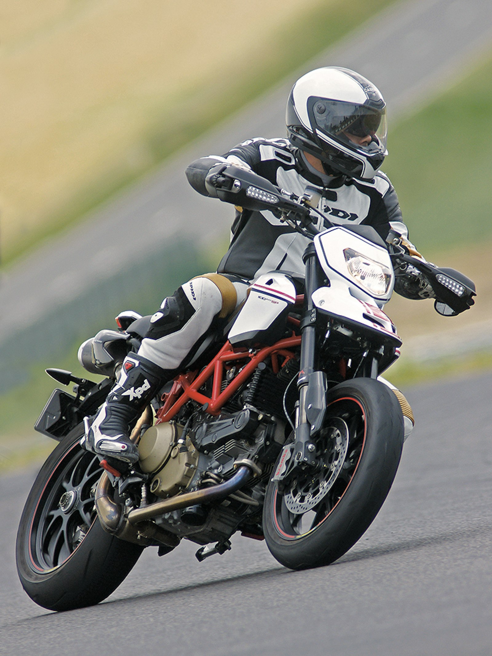 Hoe verrassend potent het blok ook blijkt te zijn, het is natuurlijk hoofdzakelijk het rijwielgedeelte dat verantwoordelijk was voor onze grijns op het circuit van Mettet. De Evo is zo’n typisch geval waarbij het geheel meer is dan de som der delen. Alles is haarfijn op elkaar afgestemd, waardoor je al heel snel genoeg vertrouwen kunt opbouwen om de grenzen van jezelf en die van de motor af te tasten. Het lage gewicht, het brede stuur en de uitstekende controle die je hebt door de smalle bouw van de machine zorgen er voor dat de Evo SP haast telepathisch aanvoelt. De machtige 50 mm voorvork is de sleutel tot het schier eindeloze vertrouwen dat de voorkant biedt: bij het insturen, in de neutrale fase en bij het uitaccelereren voelt de voorkant gewoon onverzettelijk aan. Waar de Evo echter écht het verschil kan maken met andere sportmotoren, is op het gebied van remmen. De monobloc Brembo’s waarmee de SP is uitgerust zie je doorgaans enkel op de allersportiefste straatracers en dat terwijl de top van de Hypermotard makkelijk een dikke zestig kilometer per uur lager ligt dan de snelheidspiek van diezelfde buikschuivers. De remmen zijn niet alleen hyperpotent; het samenspel van de solide voorvork, de lange veerweg vooraan en de kleverige Supercorsa SP’s zorgt er voor dat je met veel vertrouwen kunt blijven doorremmen tot aan de apex.