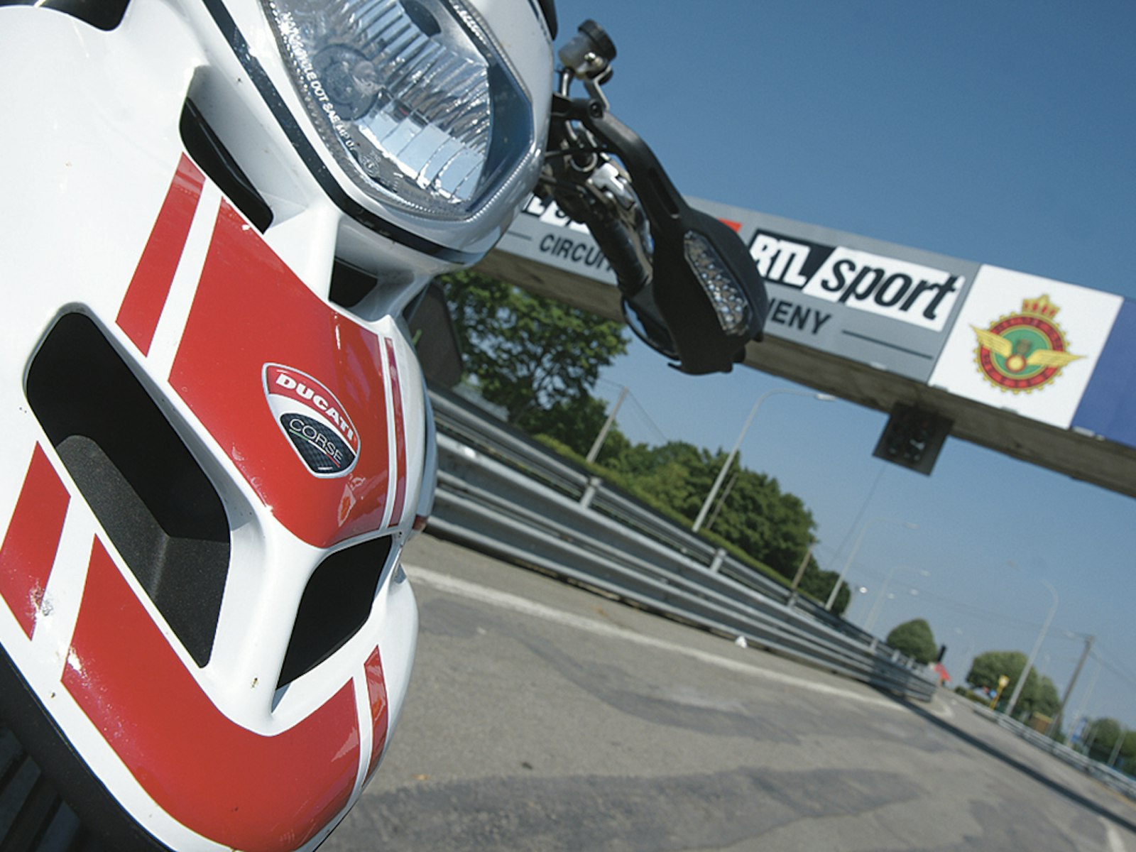 Tot daar de praktische zaken, want de SP is een motor die je stilstaand al lijkt te smeken om te mogen rijden. Met het zo kenmerkende startgeluid van de Desmodue startmotor komt de 1.073 cc L-twin met een druk op de Top Gun startknop tot leven, een even vertrouwd gevoel als het bokkige karakter van de koude motor. Maar zelfs wanneer het blok goed en wel op bedrijfstemperatuur is, blijkt het hoegenaamd geen doetje. Onder de vierduizend omwentelingen per minuut heb je in feite niks te zoeken, wat de Duc ook duidelijk laat merken door te hakkelen en te stotteren. Het hoeft waarschijnlijk geen betoog dat de Hypermotard om die reden een broertje dood heeft aan traag stadsverkeer... Zorg je er voor dat de balk van de toerenaanduiding steeds rechts van het streepje ‘4’ staat, dan bedankt de Evo je met een overvloed aan koppel. Het middengebied bulkt er al van en als je de naald nog hoger jaagt, blijft het vermogen aanzwellen tot een batterij verklikkerlichten op het dashboard aangeeft dat het tijd wordt om op te schakelen. Z’n vermogen van 95 pk is naar hedendaagse normen vrij bescheiden, het is dus vooral de combinatie van het rijkelijke koppel en het lage gewicht (171 kg droog) die voor vuurwerk zorgt. In die mate zelfs dat de Ducati in de bochtige middensectie van Mettet moeiteloos gelijke tred kon houden met literzware buikschuivers.