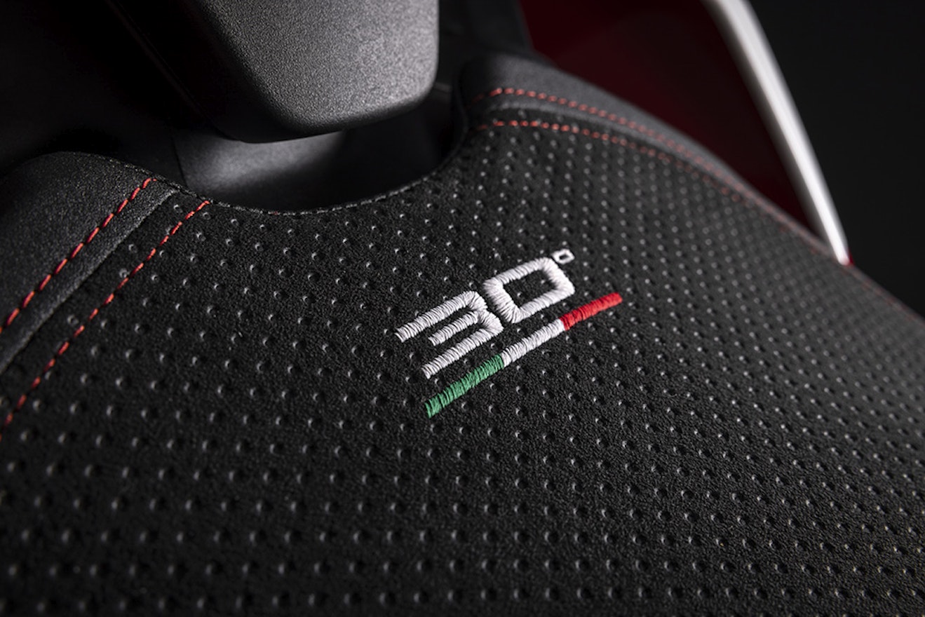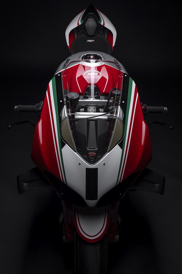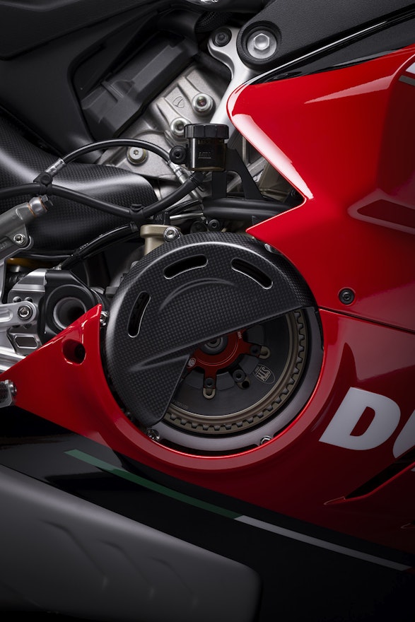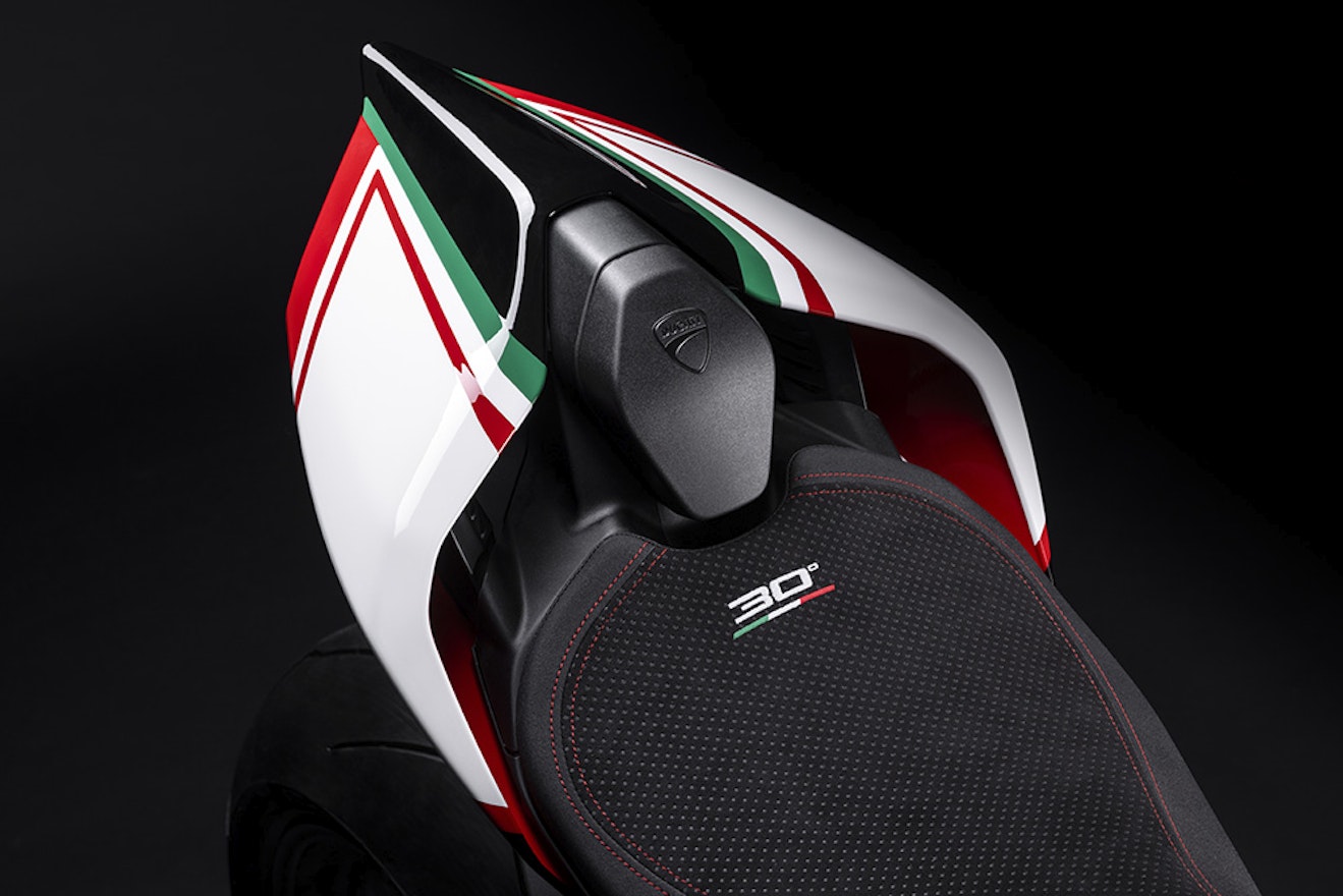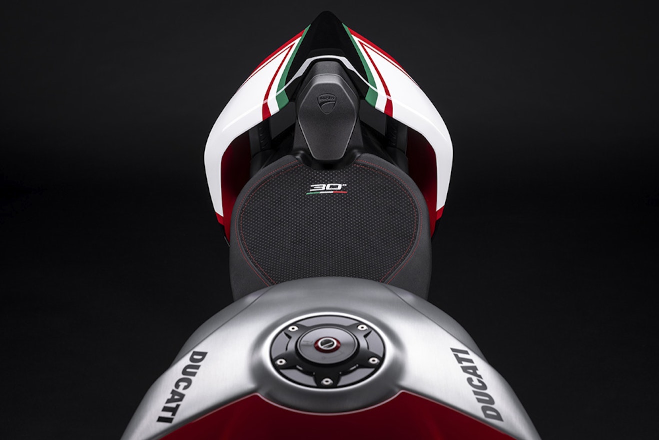 De 30° Anniversario-versie onderscheidt zich niet alleen door z'n speciale livrei van de 'gewone' Panigale V4 SP2, maar krijgt ook wat extra's mee. Dat lekkers bestaat vooral uit carbon onderdelen zoals sleuven om de remklauwen te koelen, een hitteschild boven de uitlaat en een halfopen deksel voor de koppeling.