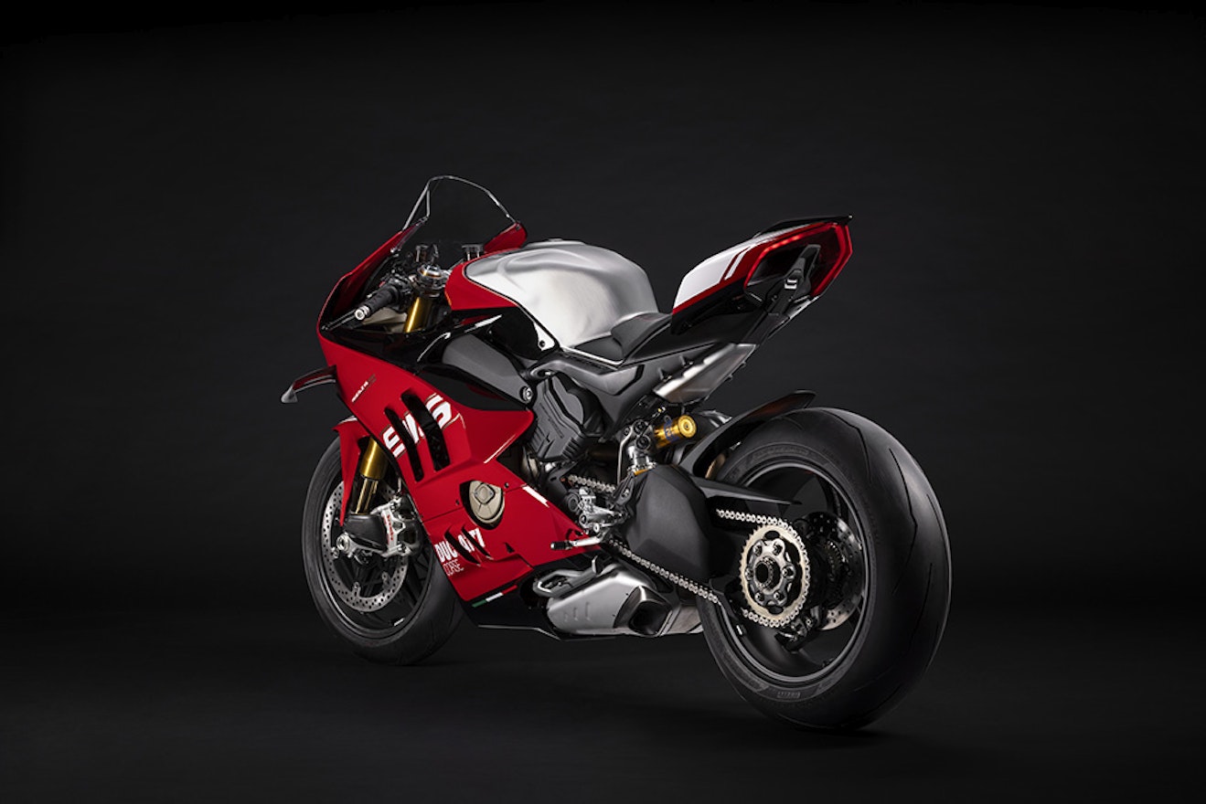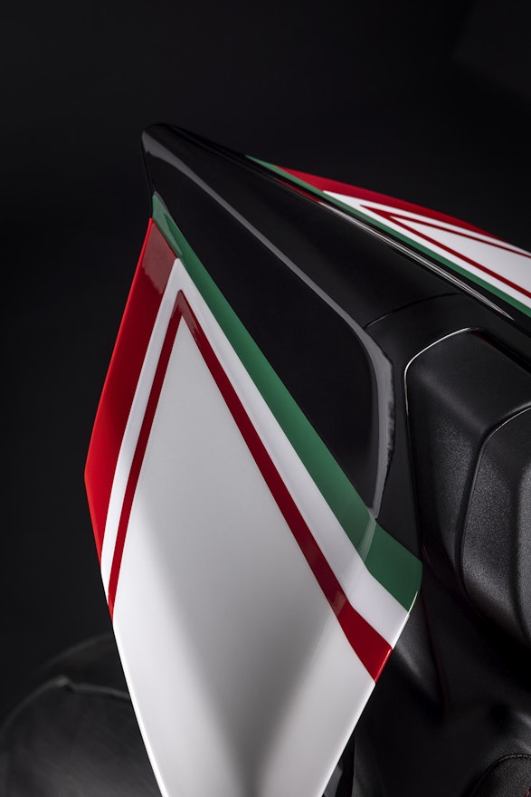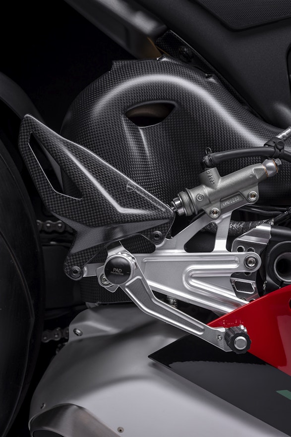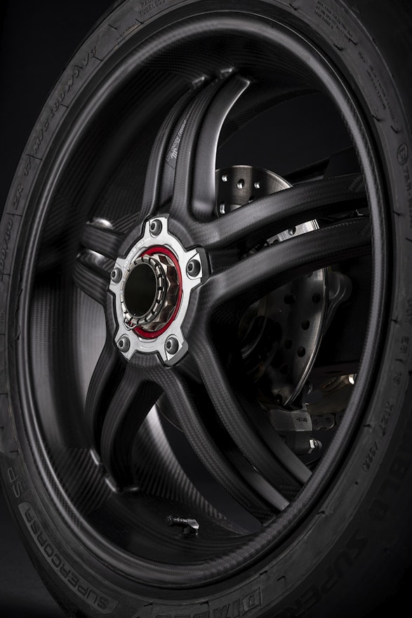 Voor circuitgebruik stopt Ducati ook covers om de gaten waarin de achteruitkijkspiegels en de nummerplaathouder zitten te bedekken. Tot slot nog even aanstippen dat de koolstofvezel wielen van Marchesini 1.4 kg minder wegen dan de exemplaren die op de basisversie van de V4 SP2 zitten.