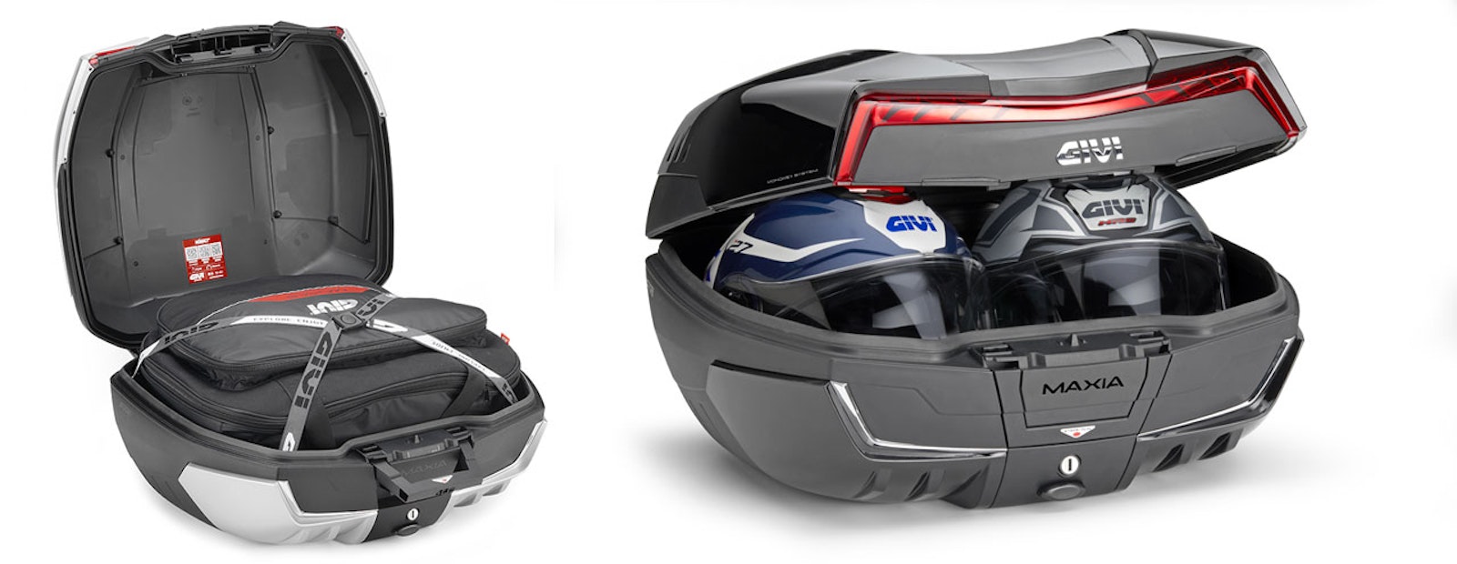 Niemand opteert voor z'n plezier voor een topcase, maar als je de motorfiets vaak gebruikt om te reizen, een pasagier meeneemt of door de file moet laveren, zijn er weinig oplossingen die handiger zijn. Givi heeft daarom hard gewerkt om een dynmaisch design te boetseren. Het resultaat is een mooie 58 liter topcase die een record vestigt op gebied van verhouding tussen buitenafmetingen en binnenruimte. Een nieuwe technologie om het kunsstof vorm te geven vermindert de nodzaak aan verstevigende ribben, waardoor er meer vrijheid kwam in het vormgeven van de binnenruimte. Daardoor biedt het visueel compactere design toch plaats aan twee helmen. Givi claimt ook dat hij beter bestand is tegen inbraakpogingen, en het nieuwe design zou ook zorgen dat het deksel natuurlijk open blijfts staan, zonder nood aan kabeltjes.