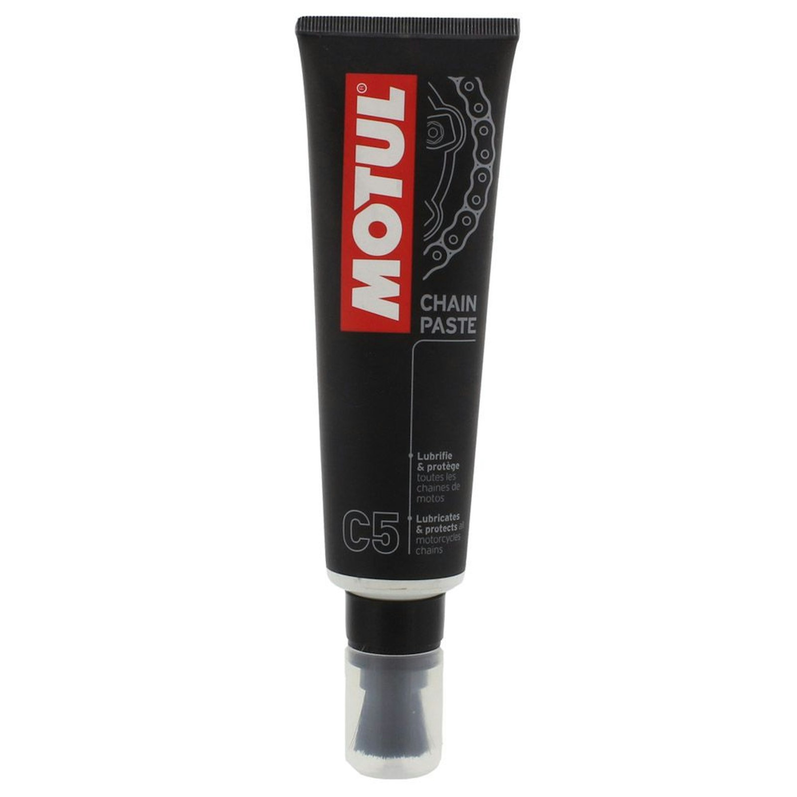 Een schoongemaakte ketting moet – uiteraard – weer gesmeerd worden. En dat doe je op een makkelijke manier met deze tube C5 kettingpasta van Motul. De borstel zorgt ervoor dat je de pasta makkelijk over elk type motorketting kan uitsmeren. Volgens Motul kan je met de tube van 150 ml je ketting tien smeerbeurten geven. Het kleine formaat van de tube maakt dat ze zo in je motorjas of tanktas past. Handig voor onderweg.