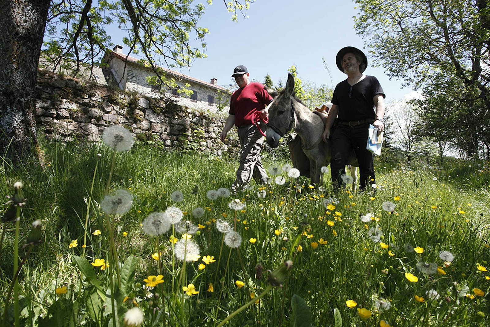 De overgang van paardenkrachten naar ezelkracht verloopt dankzij de tussenkomst van Christian vlotjes. Het gashendel is ver- vangen door een rode koord. “Strak houden, jij bepaalt waar het heen gaat”, legt Christian uit. Met het touw in de hand flitsen we onszelf terug naar een tijdperk waarin ‘een reiziger zoals ik (Stevenson dus) overal op hoongelach werd onthaald, zoals een man die een reis naar de maan plant’. Onze BMW’s hebben we in de schaduw geparkeerd, die mogen van een dagje rust genieten. Een korte snok aan het touw volstaat om Vanille de oren te laten spit- sen om meteen daarna geroutineerd te beginnen stappen. De twintigjarige ezelin legt ons een aangenaam tempo op: niet te snel en evenmin te langzaam, het mag duidelijk zijn dat deze dame al heel wat vergelijkbare wandelingen achter de rug heeft. Het lijkt wel alsof Vanille haar opleiding van Stevenson heeft gekregen want die schreef het volgende neer over het ideale wandeltempo: ‘Wandelen aan een ongelijk- matig tempo is niet zo aangenaam voor het lichaam en irriteert het gemoed.’
