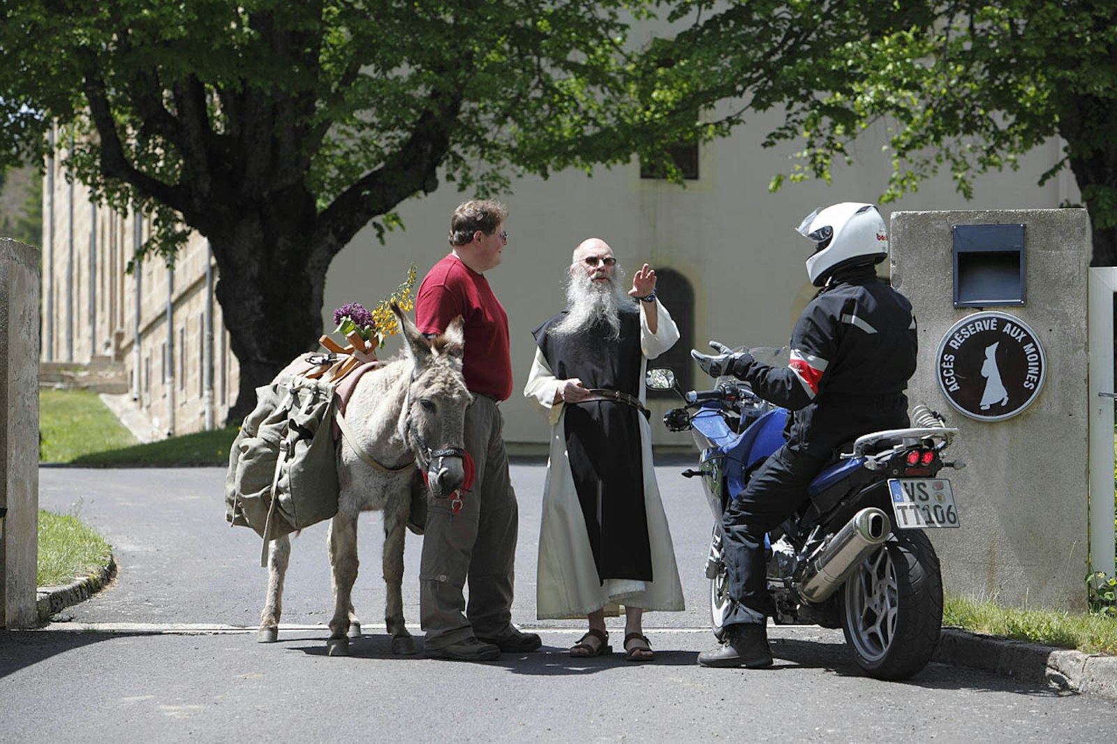 Met het touw in de hand flitsen we onszelf terug naar een tijdperk waarin ‘een reiziger zoals ik (Stevenson dus) overal op hoongelach werd onthaald, zoals een man die een reis naar de maan plant’. Op die paar nukken na hebben we over onze viervoetige helper niet te klagen, het dier stapt krachtig en met vaste tred vooruit. We komen aan de kapel van les Borries voor- bij en het meer van la Courège. Stap voor stap komt de Notre Dames des Neiges dichter. ‘Ik kwam in de buurt van mijn bijzondere doel, het trappistenklooster Notre Dames des Neiges. Ik stapte verder, dreef mijn koppige ezel vooruit in de richting van het asiel van de zwijgers. Zelden ben ik met meer schrik op een doel toe gestapt.’