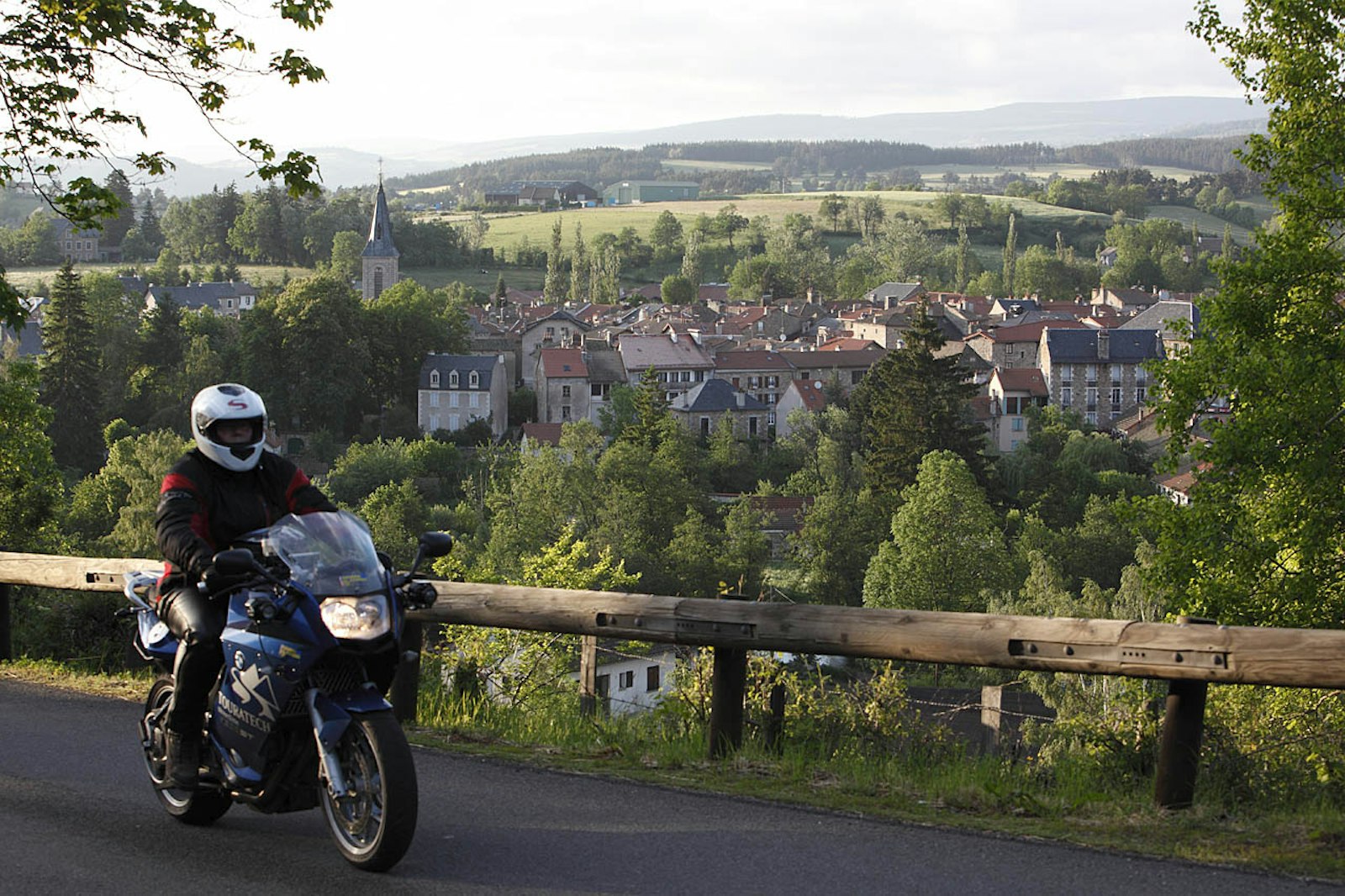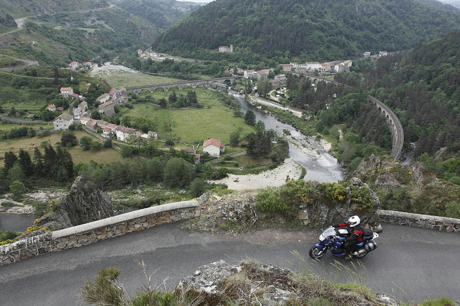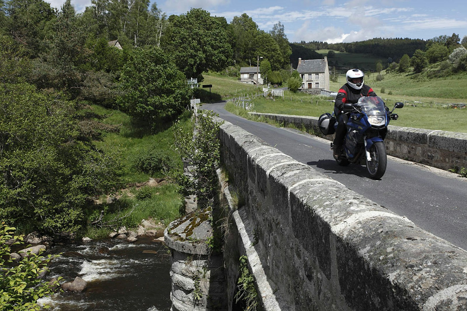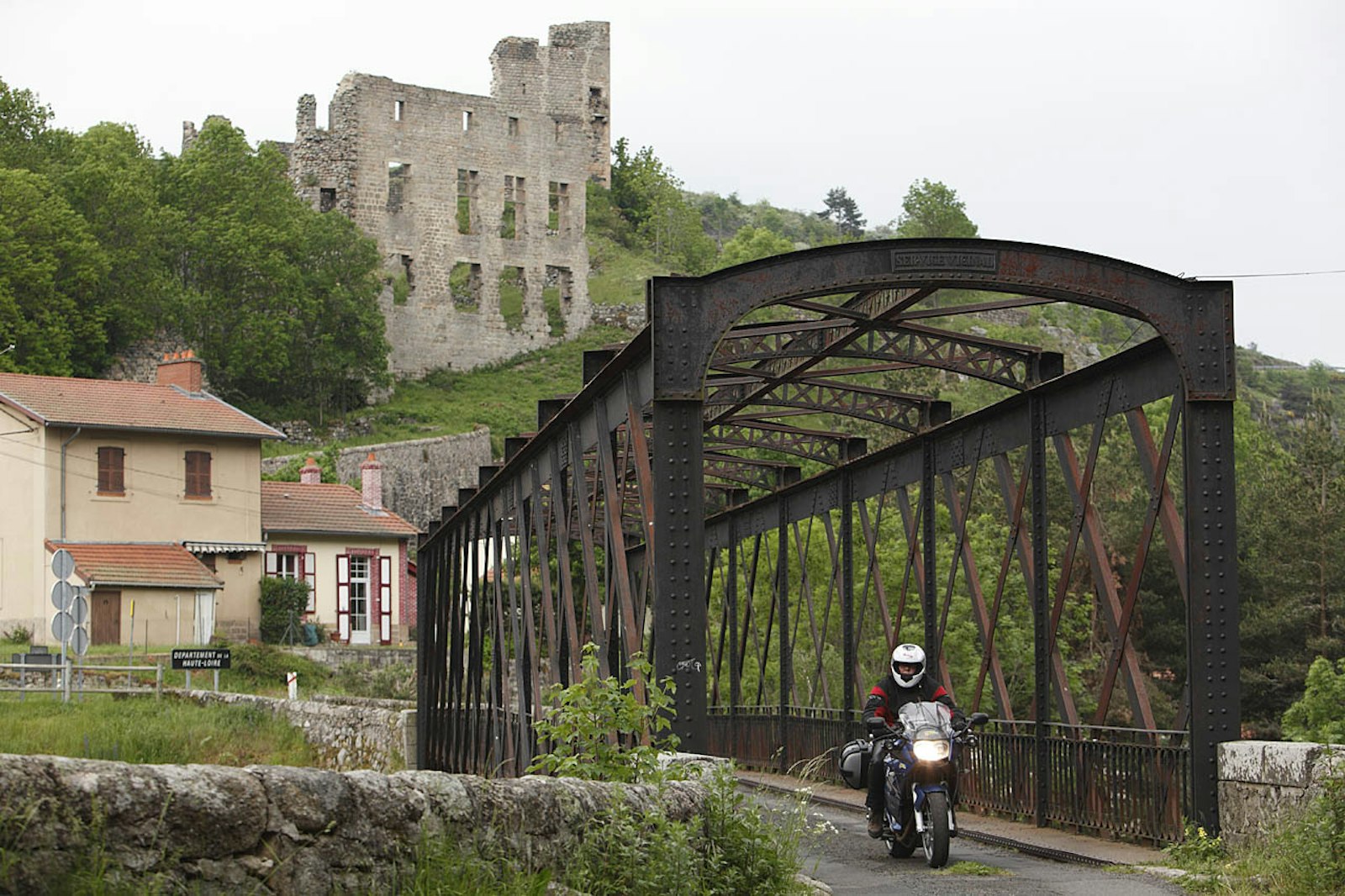 De volgende dag kraait de haan ons al om zes uur uit bed. We begrijpen zijn hint, springen in onze motorkleding en draaien de neuzen van de motoren in westelijke richting. Het is puur genieten aan het stuur van de ST, deze omgeving lijkt wel voor de motorrijder aangelegd. Je rijdt er meestal alleen over de wegen die zich van bocht naar bocht krullen. Met uitzicht op de restanten van de Joncherette-ruïne steken we over een roestbruine brug de Allier-kloof over. De balkvormige constructie van repen staal waar de weg doorheen wordt geleid vertoont opmerkelijke gelijkenissen met de Eiffeltoren. Een opschrift op de brug maakt duidelijk dat het een ‘service vicinal’ uit de negentiende eeuw is. Victoria uit Joncherette steekt de brug vaak over, net alle de meeste van de twintig inwoners van het dorpje. “Allemaal zijn we van dezelfde leeftijd’’, lacht de kranige tachtigjarige dame.
