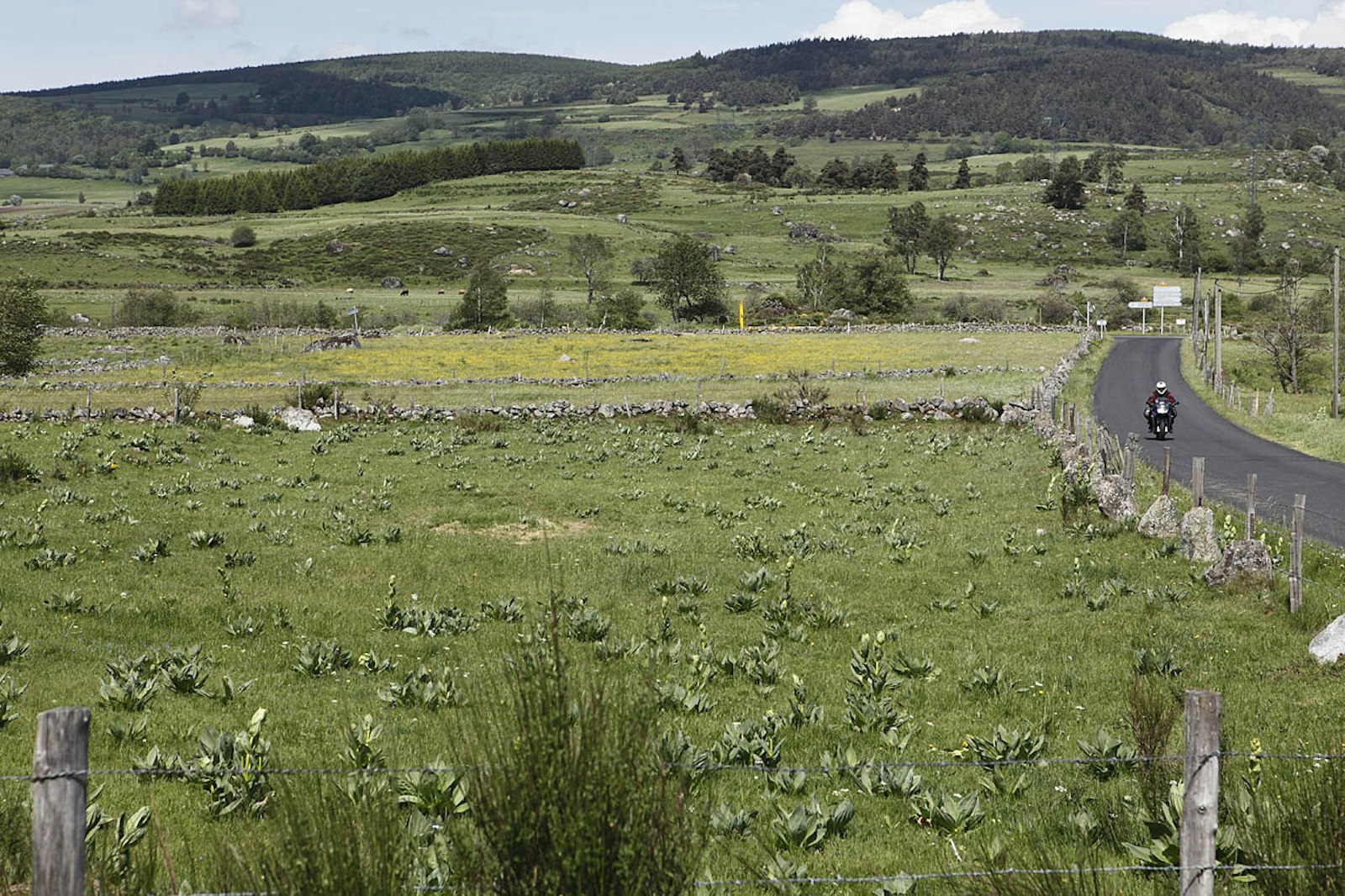 Vanaf hier trekken we terug naar het zuiden, langs de westelijke grens van Lozère. Met stenen muurtjes die de weiden afzomen, granietblokken die deels boven het grasland uit steken en houten palissades die highlandrunderen op de weide houden lijkt de omgeving bijzonder goed op de Schotse hooglanden. De D52 ‘Route en Aubrac‘ is niet meteen de favoriet van Marius. Het is een schijnbaar eindeloze reep asfalt door een hooggelegen weide richting top, de Col de Bonnecombe. “Ik dokker van de ene put naar de andere bult, wat een ellende. Ik vermoed dat de veerelementen van de ST gloeiend heet staan”, sakkert Marius. Op mijn GS met langere veerwegen heb ik gelukkig minder last van de kwaliteit van het wegdek.