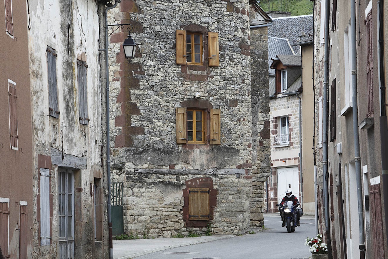 De bejaarde Sint-Bernardshond die ons schor vanuit de toegangspoort tot zijn hof toeblaft is het enige levende wezen dat we in Saint-Etienne du Vigan ontmoeten. Op de D88 – die later in de D5 overgaat – speert de ST door de bochten die afgezoomd worden met puntige rotsen en steile wanden van natuursteen. Willekeurig op de weg gedeponeerde koeienvlaaien houden je concentratie op peil. Op de terugweg richting middeleeuwen stappen we bij Jean-Louis in een koets en laten ons door paard Charlotte door bizonland trekken. De kracht van de vrij rondlopende Amerikaanse en Europese bizons is indrukwekkend, even later laten we ons door de ST naar het meest noordelijke dorp van deze middeleeuwse trip brengen. Le Malzieu-Ville gold vroeger als de parel van het dal, een marktplaats aan de perfect gerestaureerde loskade aan de oever van de Truyère.